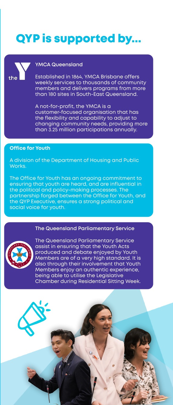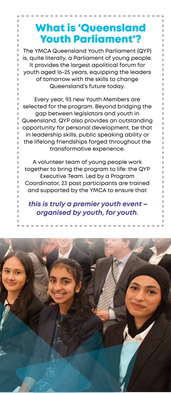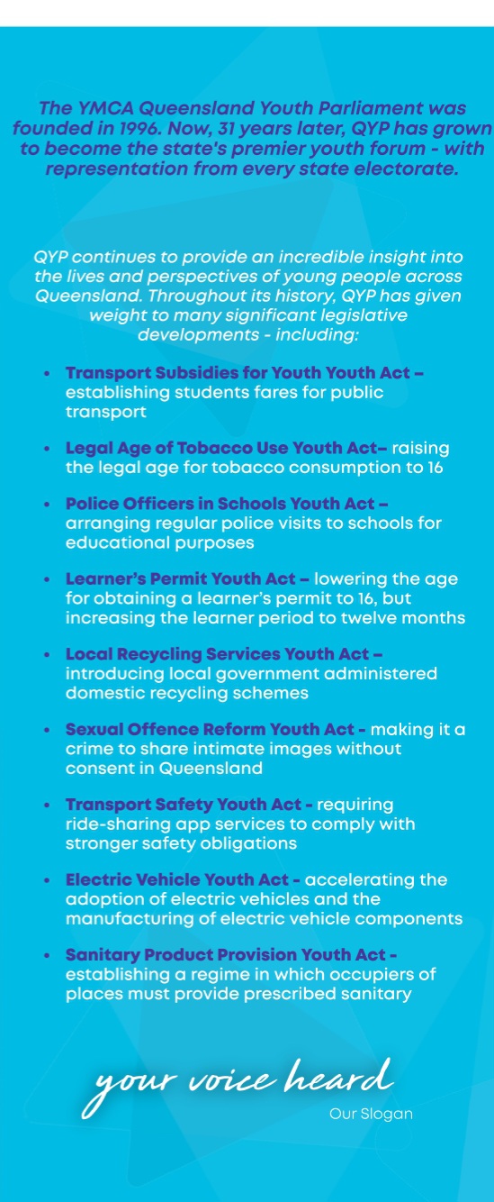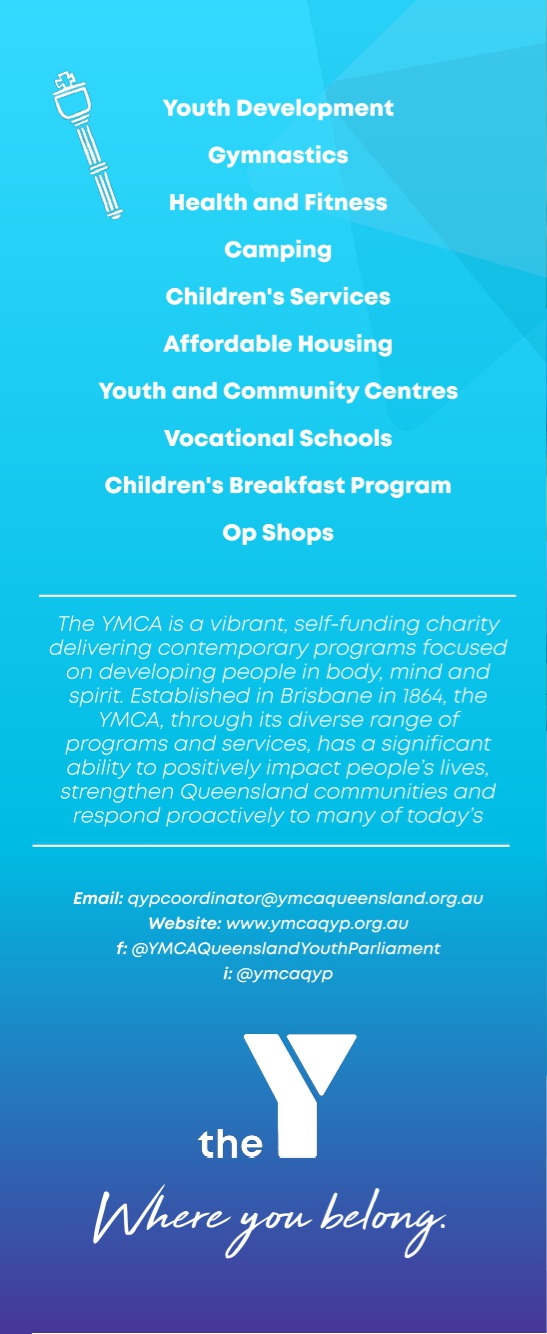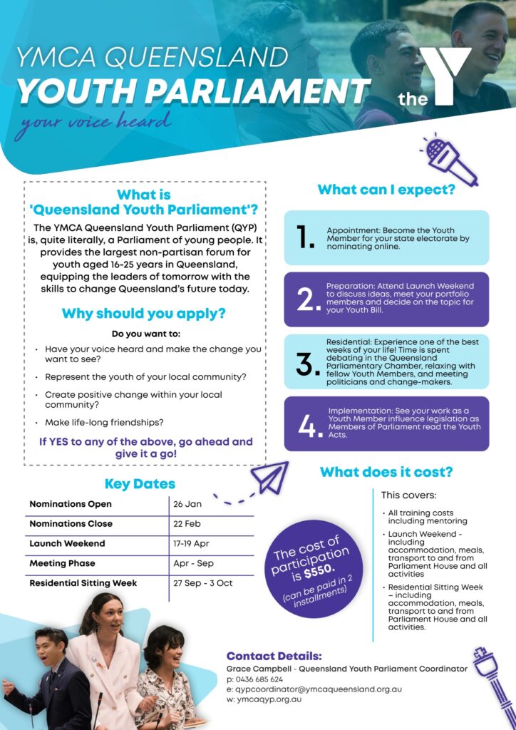 If you have specific questions, you can contact the Queensland Youth Parliament Coordinator, Grace Campbell, at 0436 685 624 or via email at qypcoordinator@ymcaqueensland.org.au.