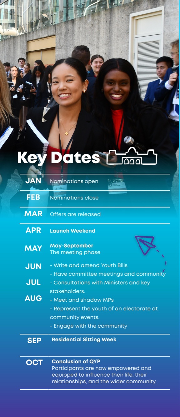 The QYP is described as “quite literally, a Parliament of young people”. It is a non-partisan forum that selects 93 young people—one for every state electorate—to bridge the gap between legislators and youth.